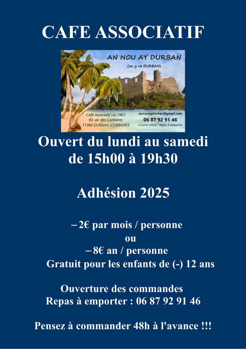 J'ai le plaisir de vous annoncer l'ouverture du café associatif An Nou Ay DURBAN au 93 Avenue des Corbières 11 360 DURBAN CORBIERES.