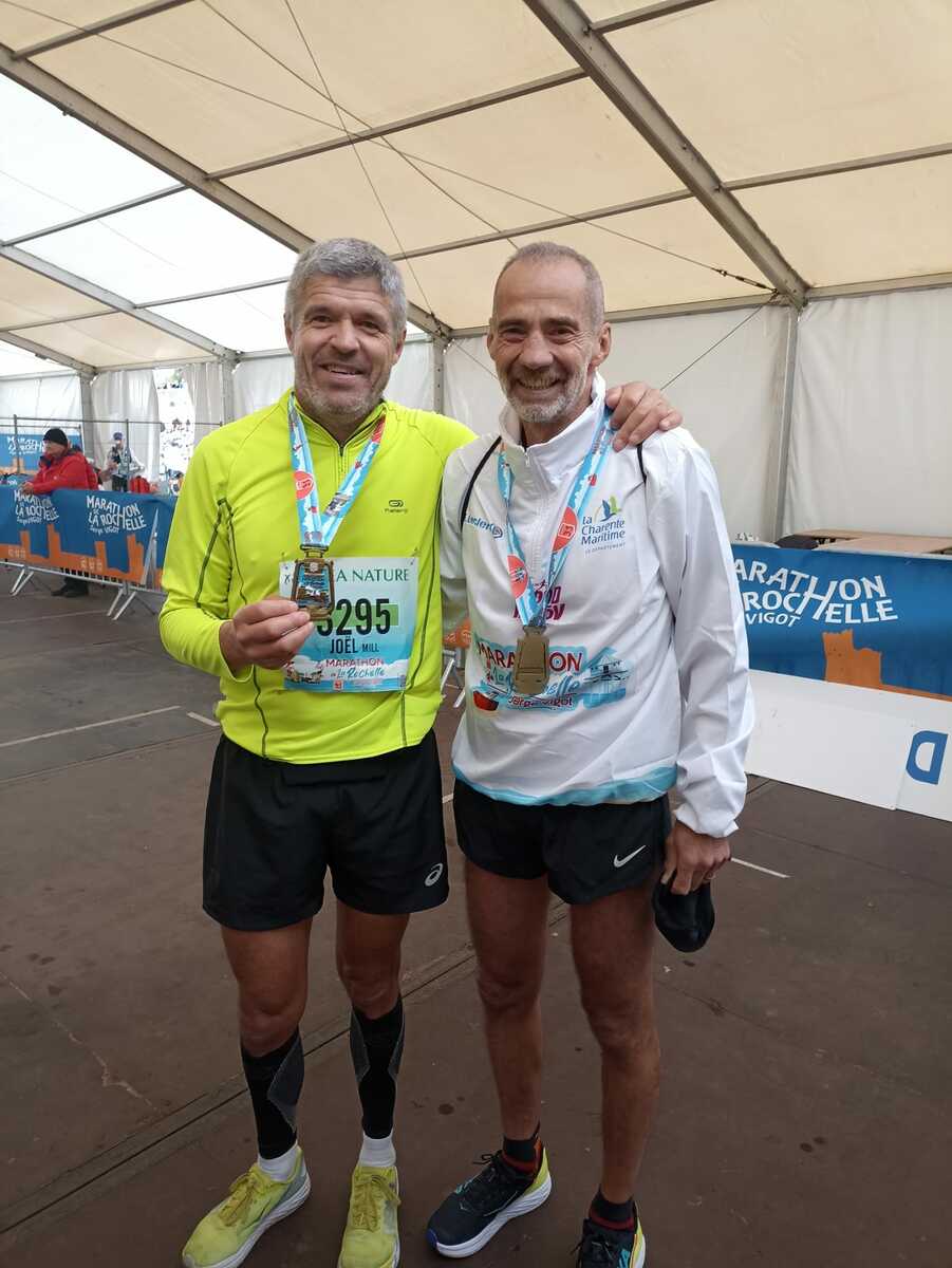 Ce dimanche 24 novembre nos amis Bruno DESSALLES et Joel MILL étaient à La Rochelle pour faire le marathon de la ville. Joel handicapé par une douleur persistante à la cheville a tout de même fini en 4h1mn. Il était pétri de crampe, on se le serait à moins. Quant à Bruno toujours égal à lui même c'est à dire toujours au top a fini en 3h28. Le fort vent qui secoue le pays ce weekend n'a pas arrangé nos deux marathoniens. Mais comme d'habitude ils sont allés puiser dans leur mental les ressources nécessaires pour franchir cette ligne fatidique des 42 km 195 m de cette épreuve mythique.