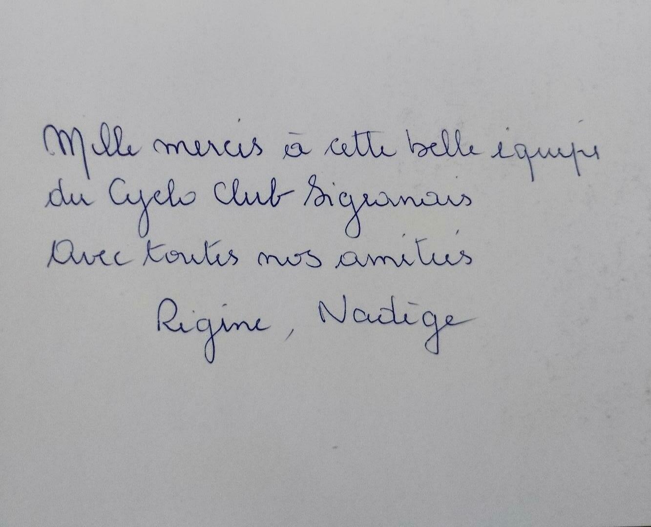 Régine et Nadège ont tenu à nous remercier pour l'hommage que notre club a rendu à Daniel. Elles ont été très touchées par nos marques de sympathie et tenaient à nous le faire savoir.