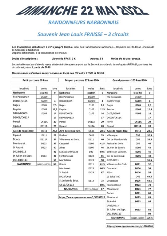 Ce dimanche 22 Mai, comme toujours, le C.C.S. honorera par ses 2 groupes la randonnée proposée par nos voisins Narbonnais "Souvenir Jean-Louis FRAISSE"