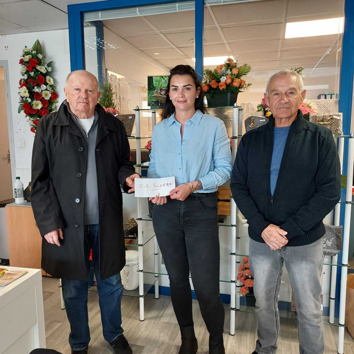 Eve la fille de notre fidèle et sympathique partenaire, F Garreta (Jardins d eden P F GARRETA) remet un chèque de soutien au Cyclo club Sigean
