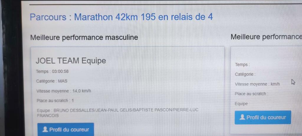 - La team joel avec Bruno DESSALLES et Pierre-Luc FRANCOIS accompagnés de Jean-Paul GELIS et Batiste PASCON. Ils terminent 1er en 3h00'58''.